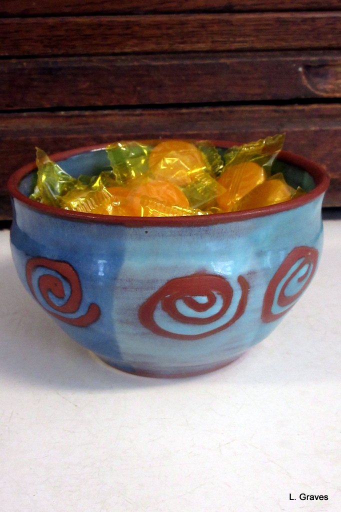 A pottery bowl, with my favorite shape—the spiral—given to me by my daughter Dee.