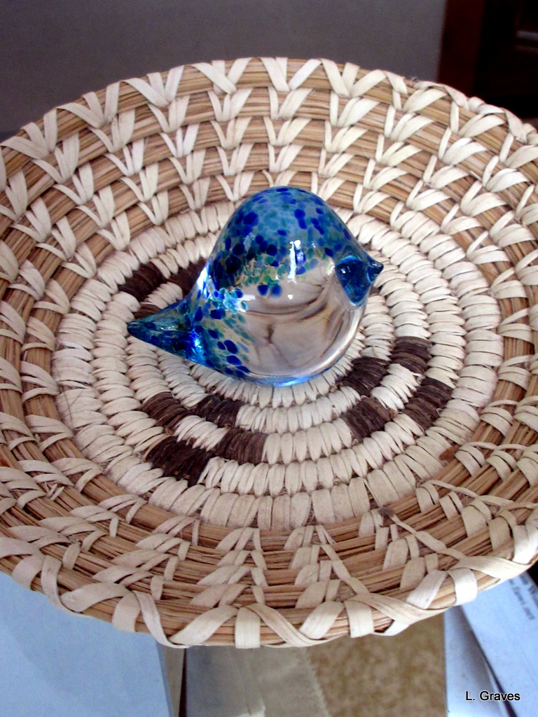 A glass bluebird, given to me by my son-in-law, Mike, sitting in a woven basket given to me by my friend Judy.
