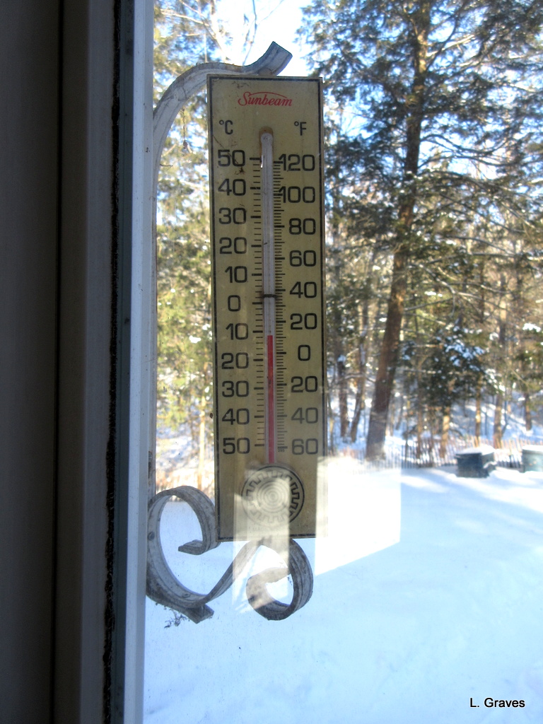 Here was the temperature this morning, before I went out to take pictures. Cold but not brutal, the way it has been in the Midwest.