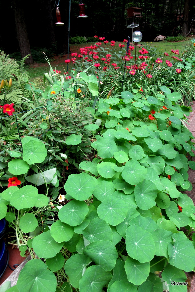 For the first time, I planted nasturtiums in the patio garden, and they are thriving. Actually, that’s putting it mildly. It looks as though the nasturtiums are ready to engulf the patio, and woe to those sitting on that side of the table. Feed me, Seymour!