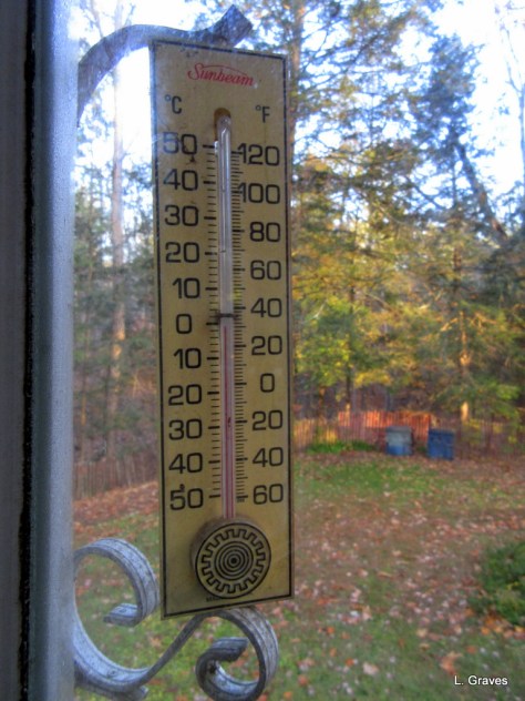 At least three weeks behind schedule, the first hard frosts of the season came this weekend. This was the temperature when I got up this morning.