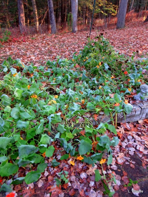 The frost nipped the nasturtiums. Although the orange flower is still perky, the leaves are decidedly droopy.