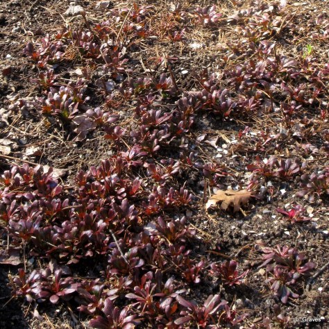 They are joined by the dark red leaves of evening primroses, which tend to be hogs and need thinning every year. Good thing the yellow flowers are so pretty. I will bring some of the cast-off plants to the birthday boy’s mother. Last year she said she would like evening primroses for her garden. I can leave a couple of pots at the end of her driveway. (This is the same neighbor who brings eggs and won’t take any payment for them.)
