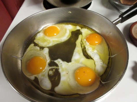 Discard the cloves when they are brown and crack four eggs into the olive oil. Simmer the eggs in the oil just until the whites are slightly set but the yolks are not cooked.