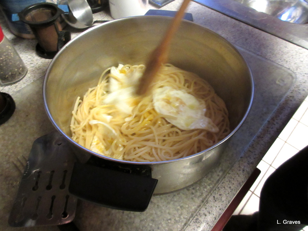 Dump this glorious mixture into a pot of piping hot spaghetti and stir until the eggs are broken up. The hot spaghetti will finish cooking the eggs.