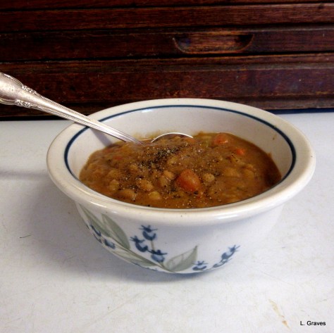 But I am going to end this post on an upbeat note of how I saved some soup I made at the beginning of the week. It was a white bean soup. I simmered three cups of white beans, and when they were tender, I dumped them into a crock-pot. I added a bay leaf, dried thyme, sage, oregano, a little soy sauce, celery, and carrots. Onion and garlic and more water. When it was done, a half-cup of nutritional yeast.