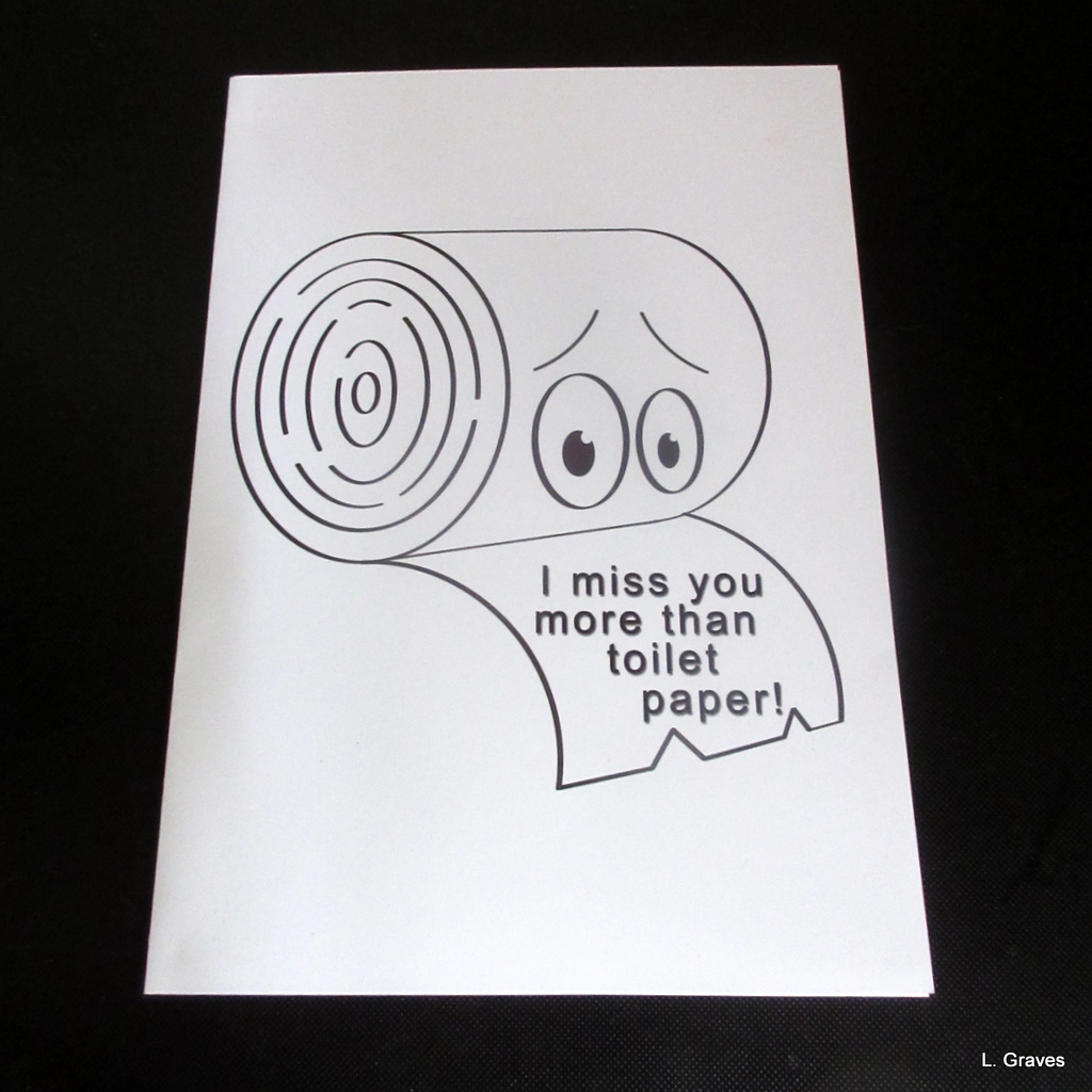 Finally, the last card is a humorous one, sent to me by my long-time friend Dawna. Although the message is humorous and a reflection of how an everyday commodity became scarce during the early days of the coronavirus, the message inside was heartfelt: “Miss You!” We only live about five miles apart, but we have not seen each other for months. I miss her, too.