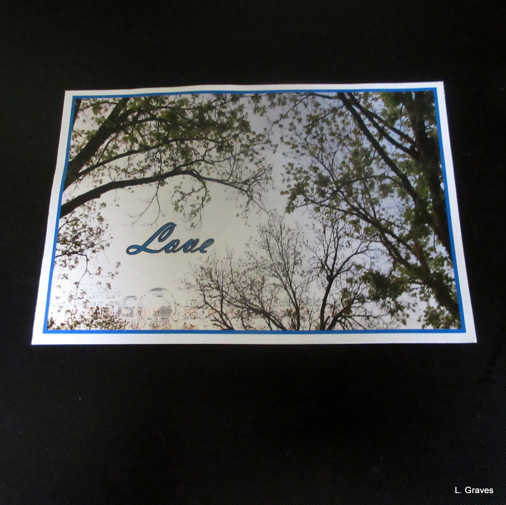 The card just beneath it is from my blogging friend Jill. The picture was taken of a tree in front of her house. She wrote, “The pecans were just leafing out—they are the last to get leaves.” Such a lovely description.