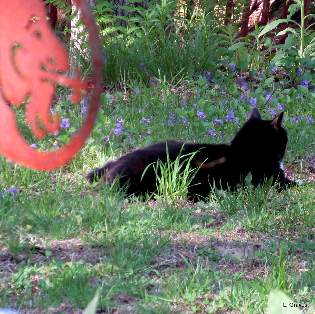 Looks as if your cat is enjoying a sunny day! I love your Purple Iris.
