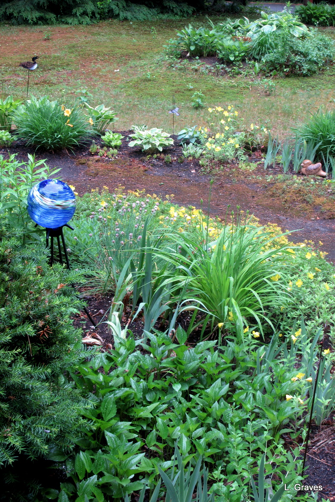 Here are a couple of pictures of our rainy yard. (Or garden as my friends across the pond would say.)