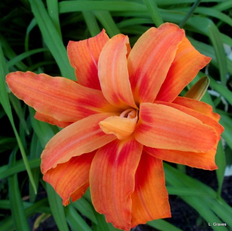 As a rule, daylilies do not do well in my shady front yard. Not enough sun in most spots. This one isn’t exactly loaded with blooms, but there are just enough to make a good showing every summer. Usually, I’m not a fan of double flowers, but this one has me hooked. Maybe it’s the orange. Wish I could tell you what the name is, but like the butterfly, this daylily has been here for many, many years, and the little stake that came with it is long gone.