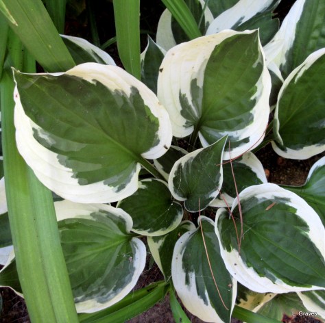 I am absolutely smitten by the hosta below—the heart-shaped leaves and the large white border that brightens any spot in the garden. And do you notice many holes in the leaves, the munching assaults mounted by slugs and snails? No, neither do I. Slugs and snails are a fact of life when you live in the woods. I have tried various eradication methods over the years, from handpicking to beer in bowls to Sluggo. And still the slugs and snails come. Therefore I have pretty much given up. Although the slimy little blighters chew the leaves to ribbons, the plants are not destroyed, and each year the hostas return hopefully, fresh and green.