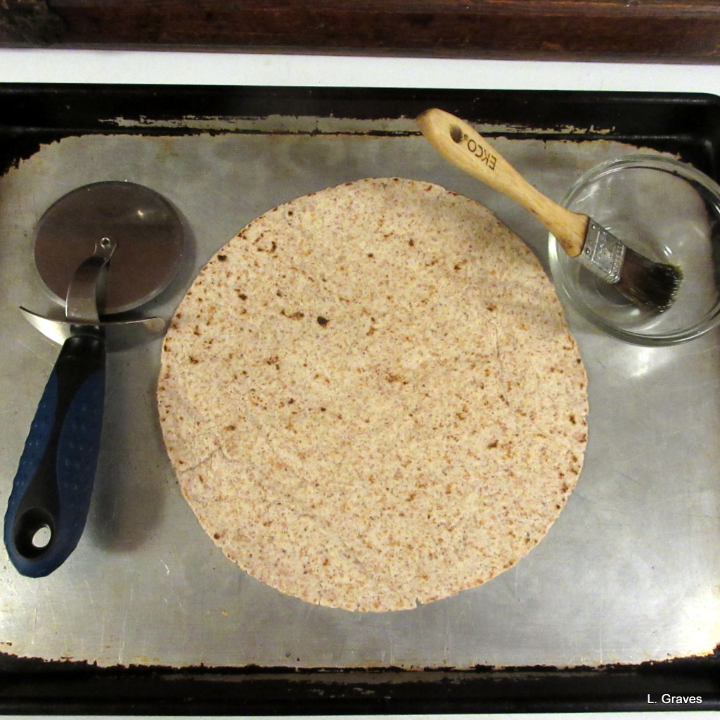 The process couldn’t be easier. Put the tortillas on a cookie sheet, and cut into a dipable size. A pizza cutter works really for this. Brush the tops with a little olive oil and sprinkle with some salt. Bake at 375°F for ten minutes.