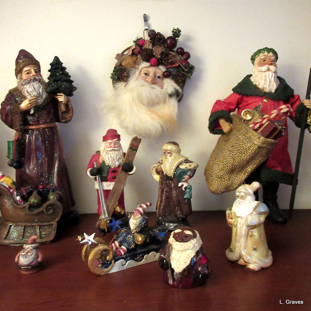Here are some of the many Santas that are decorating the bookcase in our living room Most of the Santas are gifts, and how wonderful it is to see them again after nearly a year.
