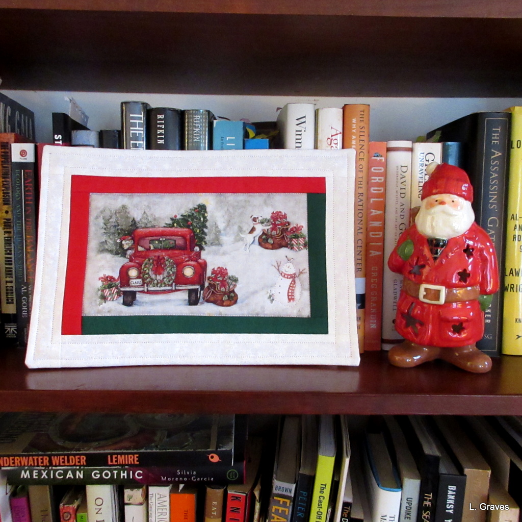 This picture features two gifts: The lovely panel is from my blogging friend Judy of New Hampshire Garden and Thread, and my mother gave me the Santa Clause.