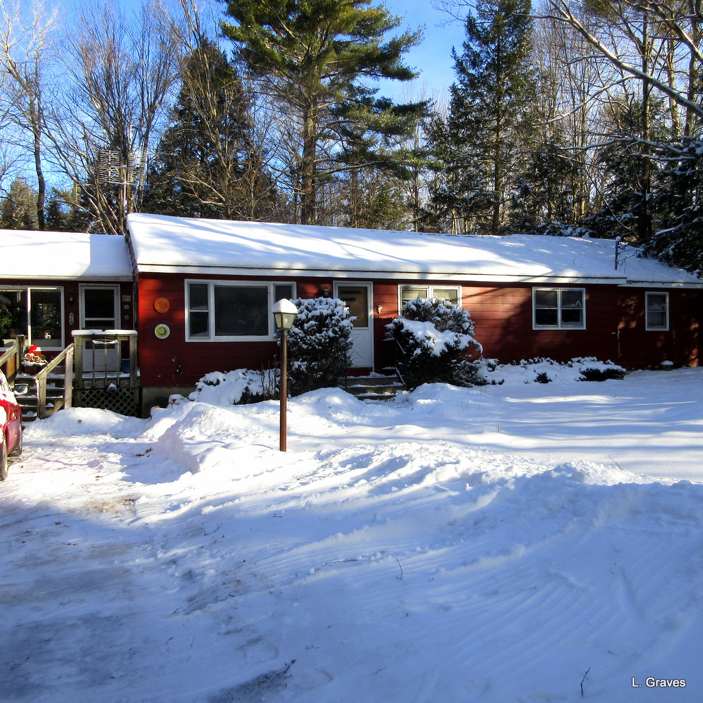 Here is a picture of our house nestled in the snow. The red makes it look festive, I know.