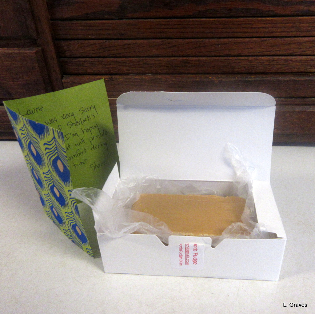 An unexpected gift came in the mail yesterday—a box of fudge from Sweet Tooth Fudge. I have long been a fudge enthusiast, and Sweet Tooth Fudge, right here in Winthrop, makes some of the best. Ever. This treat was sent by Shane Malcolm Billings, the much beloved former Adult Services Librarian of our town’s library. On the enclosed card, Shane wrote that he was sorry to learn of Sherlock’s passing and hoped the treat would provide some comfort during a sad time.