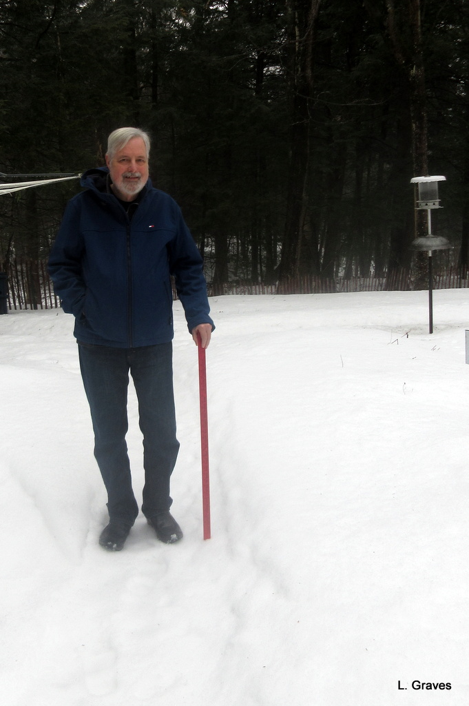 Long-time readers of Notes from the Hinterlands will know what March brings to central Maine—the return of Snow-Gauge Clif. Each week until the snow is gone, usually sometime the end of April, my husband, Clif, will venture forth with his trusty red yard stick to record the melt rate.
