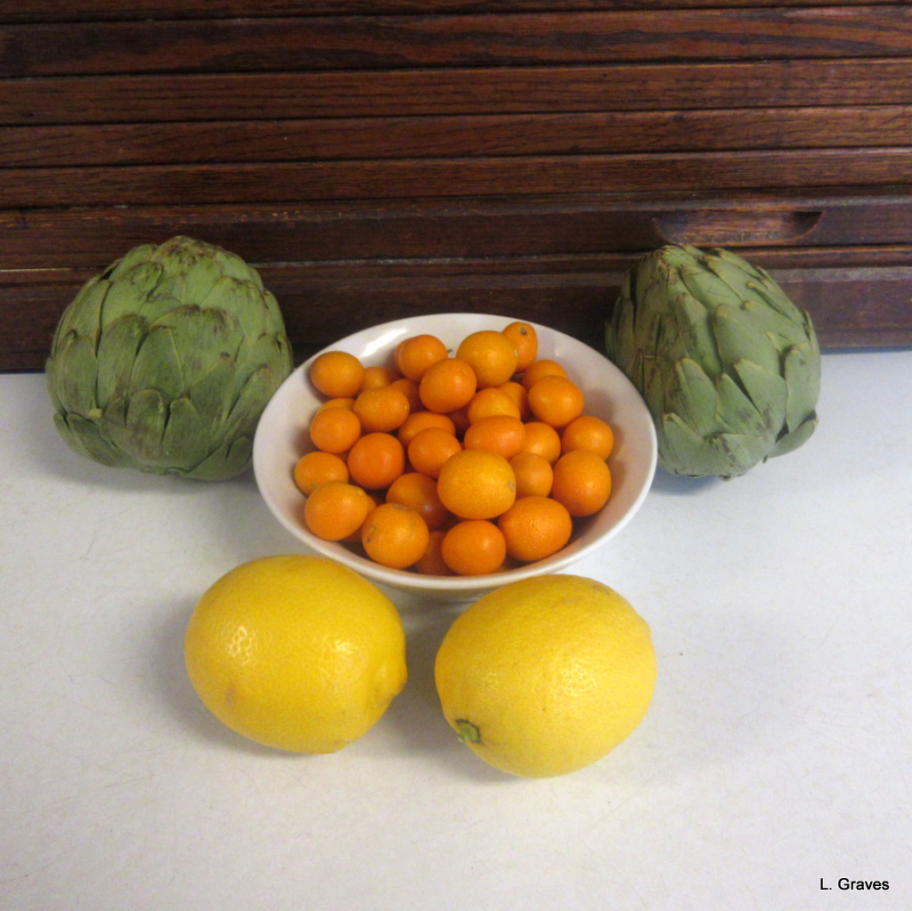 Therefore, this Friday I really, really needed simple pleasures to cheer me up, and just in the nick of time, all the way from my blogging friend Betsy in California, came this assortment of deliciousness. An added bonus is that I had never had kumquats before, and what a treat to sample these tart, citrusy gems, which come from Betsy’s backyard. (The lemons come from her backyard, too, and the artichokes from a farmers market.) Many, many thanks, Betsy!
