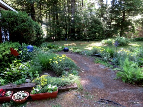 My gardens are what I call June and July gardens, when there are a few other colors besides green to liven the yard. The slugs and snails have yet to chew the hostas to ribbons, and everything still looks fresh. In early summer, the gardens are at their best, and I never get tired of looking at them.