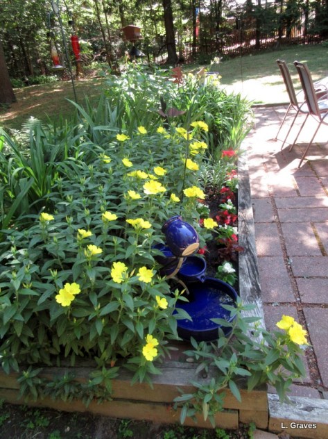 The yellow repeats itself in the backyard. The evening primroses are one of the few flowers that actually thrive in these gardens on the edge of the woods. Wish the evening primroses lasted longer.