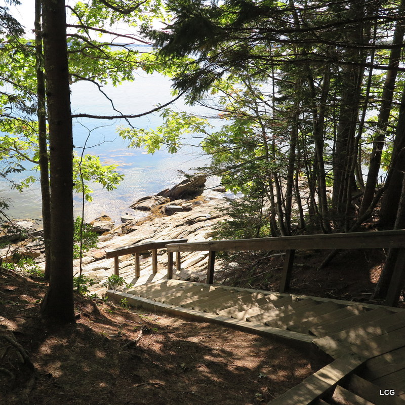 I came to a steep rocky trail leading to a series of wooden steps and carefully went down to the water. As I reached the shore, a heron flew by, disappearing before I could get a picture.