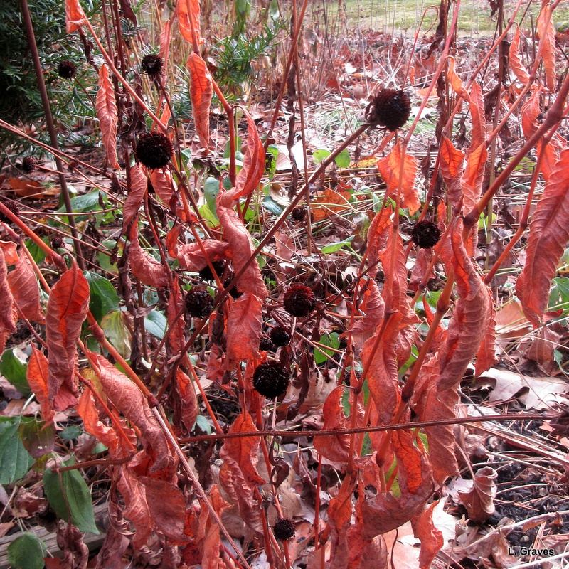 Black-eyed Susans, their petals long gone, lean into another plant, whose name, alas, I have forgotten.