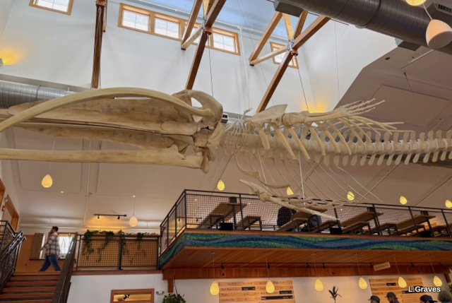 I wondered, was the skeleton real? As it turns out, it is. The skeleton came from a female fin whale (Finny) with a too-short life—between three and five years old—who washed up on a Maine beach in 2023. With support from Maine Beer Company, Finny’s skeleton was recovered and reconstructed by Whales and Nails. As beautifully described on Maine Beer Company’s website, the skeleton gives “a second life to spark curiosity, and connection to these magnificent animals.”