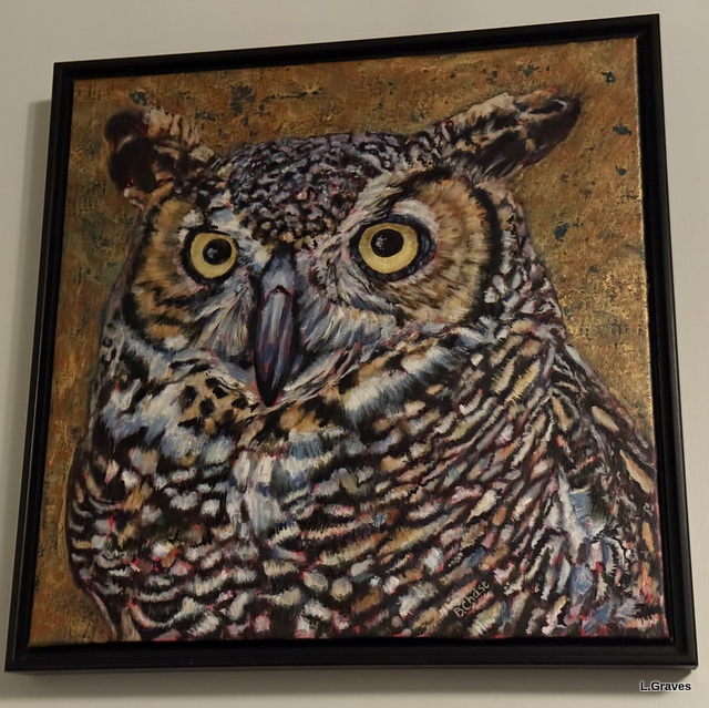 In my last post, I mentioned that Dee bought some art at the Maine Evergreen Hotel in Augusta, Maine. On yesterday’s snowy Sunday, she hung them in her room, and here is a picture of one of them, a Great Horned Owl by Barbara Chase. (Next week, I’ll feature the other one she bought.)
