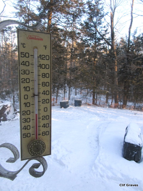 The cold has certainly come to central Maine. When we got up this morning, there was ice on the inside of the windows, which melted as Clif stoked the wood furnace and brought the inside temperature up to something approaching warm.