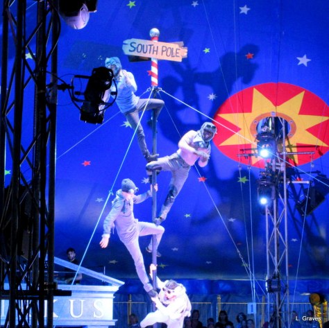 And strut it they did in a series of jaw-dropping pieces. Over and over, as performers whirled, stretched, spun, walked on the tightrope, and did other amazing things, we said in astonishment, “Oh, my gosh! How do they do that?” In one piece, young girls as octopuses stretched and twisted their legs in ways I didn’t think was humanly possible. In another piece, featuring explorers from the South Pole, young performers zipped up and down the “South Pole” at breakneck speed, stopping just short of hitting the floor. Two young girls on the trapeze showed not only great strength and agility but also great trust in each other. One wrong move, and down to the floor they would have crashed.