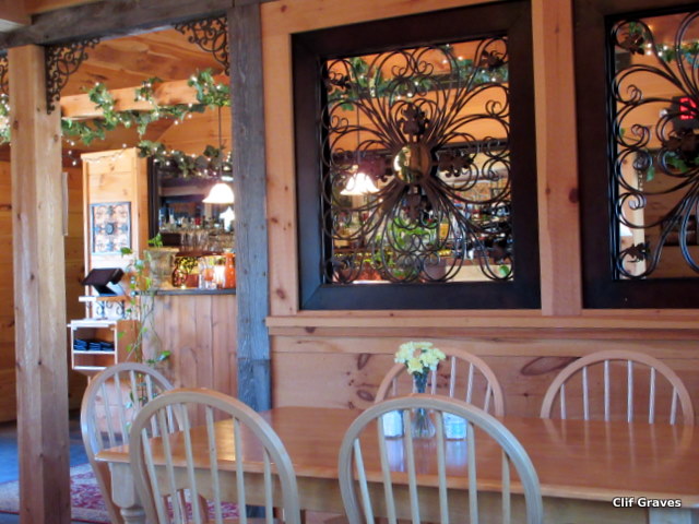 On Saturday, Clif and I went to Waterville to see their library’s art show. But before going to the show, we had to sustain ourselves with lunch at the wonderful Riverside Farm Restaurant in Oakland. (Thanks, Rose and Steve, for the gift certificate.) Inside, Riverside Farm is rustic but oh so pretty.