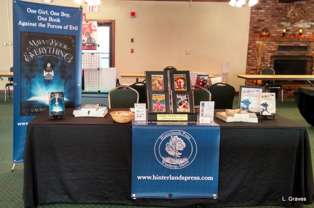 So on Saturday, after loading the car the night before, off I went by myself to Wayne, Maine. I realize I’m a little spoiled by having a husband who is happy and willing to go with me to the various events. But it is so great to have another person at the table, to take care of making change, to be there for bathroom breaks, to help with set-up and break down.