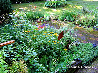 As I happily surveyed the wood, I glanced at the front yard, which seemed suitably perky on this lovely day. (It helps that at a distance I couldn’t see the holes and shredded leaves left by the munching slugs and snails.)