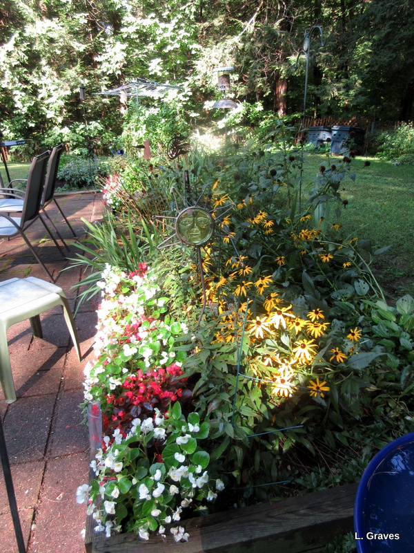 Despite the rainy summer, Clif, Dee, and I have managed to slide in many lunches and suppers on the patio. Because of the rain, the mosquitoes are still a nuisance—most years they are gone by August—but we have citronella torches to help with the problem.