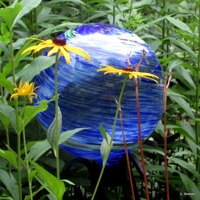 And to further cheer myself up, I took a picture of black-eyed Susans against the blue gazing ball.