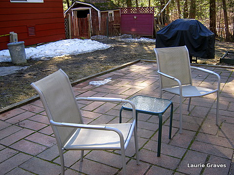 Last weekend, when we celebrated Shannon’s birthday, the backyard was muddy, and the outside faucet was blocked by a small bank of snow. The driveway and yard were a mess of twigs, branches, and the last of the leaves that had come down after the fall raking had been done. I blush to admit that the front porch still had Christmas greenery in pots. To top it all off, the edge of the front yard had enough sand for a small beach. It was a hard winter, and the road crew frequently sanded the slippery roads.