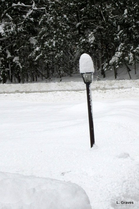 Little Gideon, the guardian of our yard, is nearly buried beneath the snow.