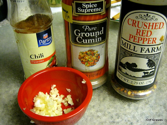From my cupboard I took chili powder, cumin, and red pepper flakes. Making sure the covers were off, I lined the spices next to the stove along with salt. (No, Shannon, I did not measure the spices.)
