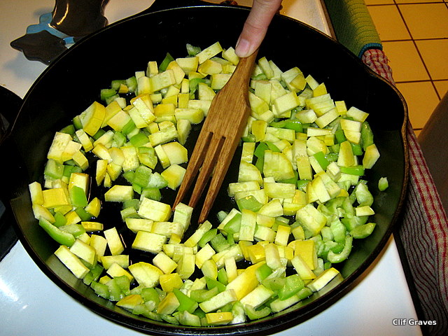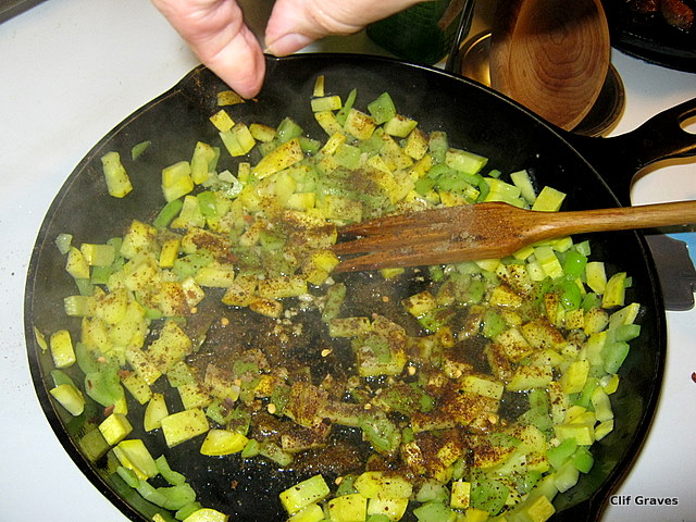 I put about a tablespoon, maybe a little more, of oil in a skillet, and heated it up. Then I added the peppers and summer squash and sautéed them until they were soft but still a little crunchy—for about five minutes or so. I didn’t time them. I just watched and tasted until they were cooked to my liking. I added some cooked chicken sausage and the garlic. Next came the spices. I sprinkled in some chili, a little less cumin, a pinch of red pepper, a shake or two of salt. I tasted. Clif tasted. In went more chili and more red pepper. There, it was just the way we liked it. The trick when not measuring is to start with a little of the spices. You can always add more, but you, of course, can’t add less.