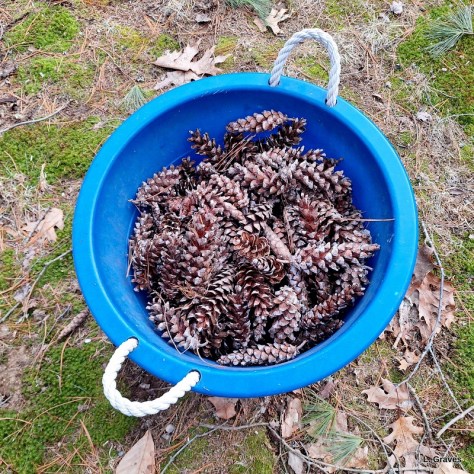 So many pine cones had dropped that I decided to go outside to gather them for kindling for our wood furnace down cellar.