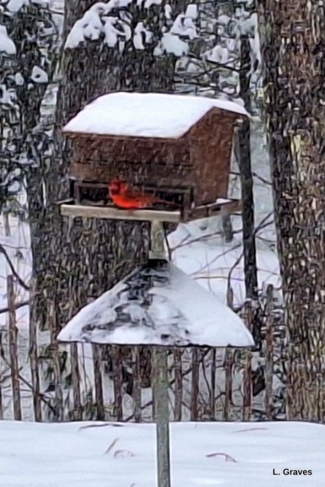 During the storm, from the bathroom window, I snapped a picture of this pretty fellow, a cardinal. The cardinal is not as clear as I would like him to be, but nonetheless I thought the red against the snow was pretty.