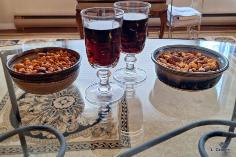 Last Tuesday, March 19, was our forty-seventh wedding anniversary. Holy cats, Clif and I have been together for a long time. Because Tuesday was a work day for Clif (he does book design), Me (I write books), and our daughter Dee (she does web work),in the evening we had a simple celebration of nuts and drinks as well as veggie sausages and dairy-free ice cream. The goblets were given to us by a good friend on our first wedding anniversary, and we bring them out every year for a celebratory drink.