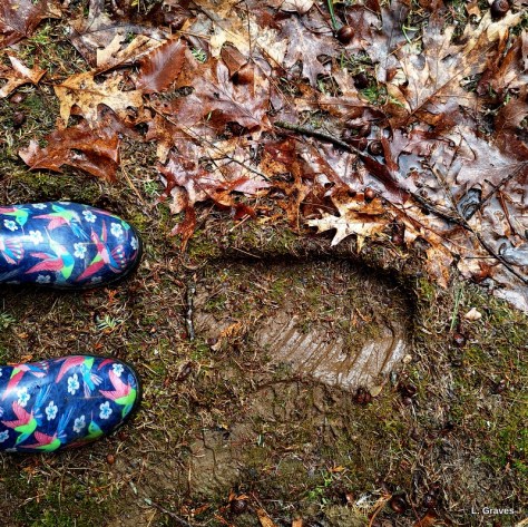 Not surprisingly, the mud is in full swing. In the backyard, the footprint left by my Sloggers tells the story. Squish, squish. I’m itching to get back there and do some clean-up. Not until the mud dries up.