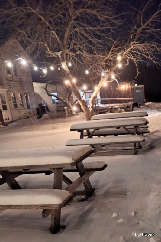 To get to the old barn with its tasting room, there is a pathway lined with lights and snowy picnic tables, and it felt like a magical winter scene in the still, cold night.