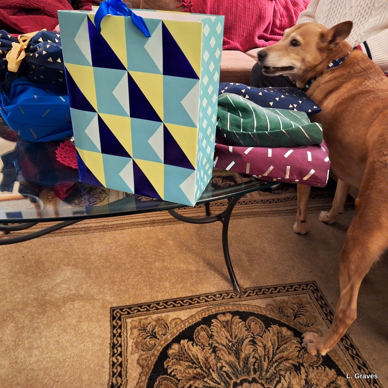 We left after the music was done and headed back home, where there were presents and an interested dog. We had cake, of course, but I forgot to take a picture of it.