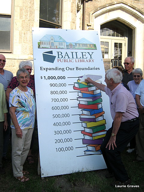 Yesterday was an exciting day for the Bailey Library Expanding Our Boundaries Campaign Team. We have reached the million-dollar goal of our campaign, and we were able to add two books indicating this on our sign outside the library. Oh, happy day!